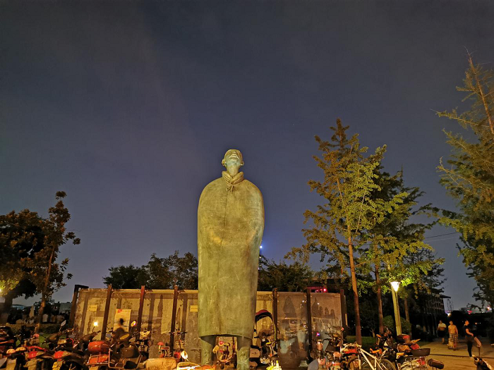 《高山流水》青銅雕塑,參考秦兵馬俑的照明手法,以白色燈光重點(diǎn)照亮雕塑頭部,仿佛在迎著陽(yáng)光沉思。