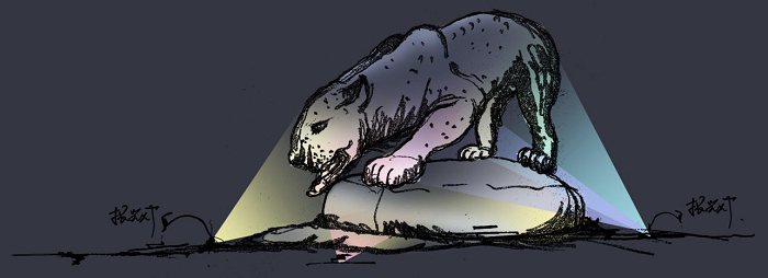《狼來(lái)了》百匹狼群,以重點(diǎn)照明的方式著重刻畫頭狼及狼群的氣勢(shì)。狼群的后部,在狼眼處涂抹熒光粉,配合黑光燈,使狼眼在黑暗處散發(fā)出寒光。從整體上感覺(jué)狼群漸漸從黑暗中走出,給人一種狼來(lái)了的動(dòng)態(tài)氣勢(shì)。