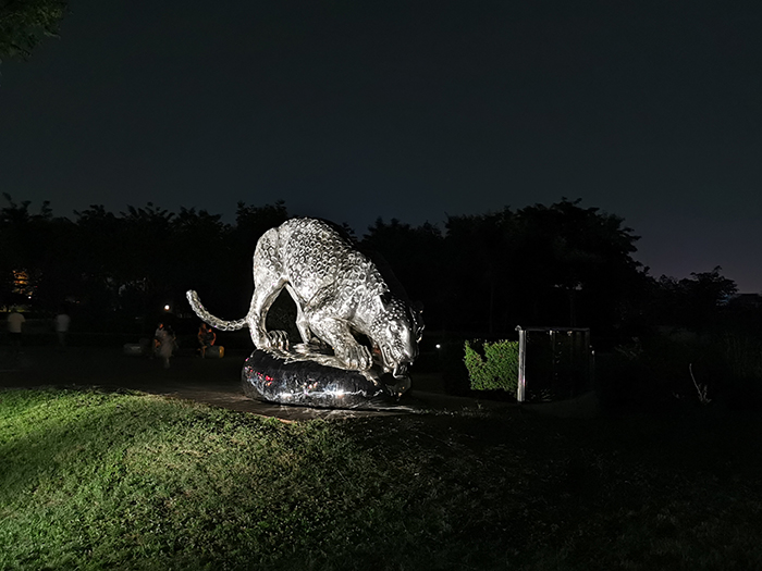 《金錢豹》以彩色小型投光燈照亮,通過(guò)鏡面不銹鋼的折射,雕塑變得色彩斑斕。