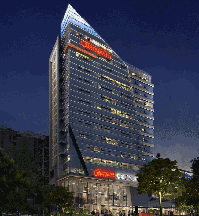 都江堰希爾頓歡朋酒店是一座以希爾頓為主題品牌的高端酒店,信達電通對其進行整體夜景照明設計。
