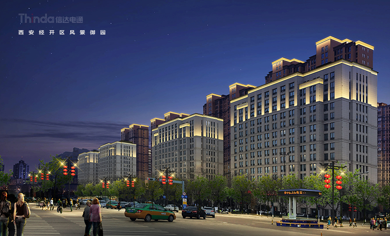 風景御園位于西安市經開區鳳城八路,在市政府對面,本項為商業辦公樓夜景照明設計,建筑的立面材質為淺色石材為主。四棟建筑的建筑形態相同,沿縱向結構游走,整體造型簡潔、大氣,本項屬于高層建筑。