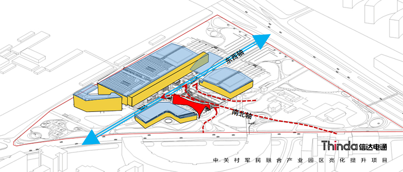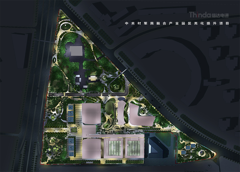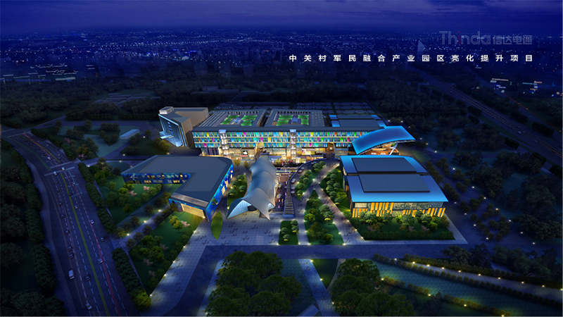 中關村軍民融合產業園區的亮化設計主要以建筑燈光為主體設計方向,用燈光的形式突出建筑結構特點,突出時尚、創新、科技、新潮的融合產業園。園區建筑結構整體簡潔、大氣,信達利用光影效果及景觀元素,打造東西、南北軸向的建筑縱身層次,整體以各種幾何形體組合而成,燈光在設計的同時尊重建筑本身的理念,優化夜景氛圍,通過塊與面的結合,塑造一個大氣魄、大追求的文化產業新品牌。